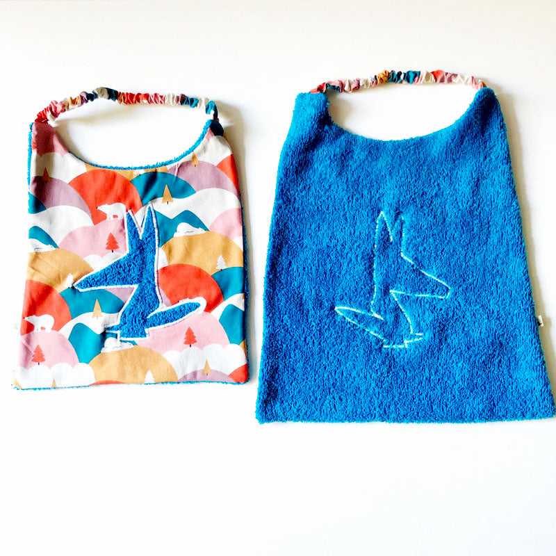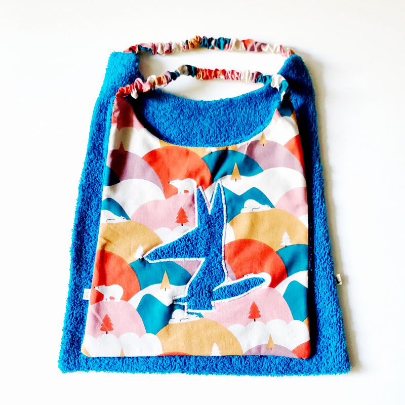 Bavoir réversible en éponge bleue doublée de tissu coton à motifs paysage et ours polaire avec applique loup. Pratique le tour du cou en élastique pour que l'enfant puisse enfiler son bavoir tout seul comme un grand.