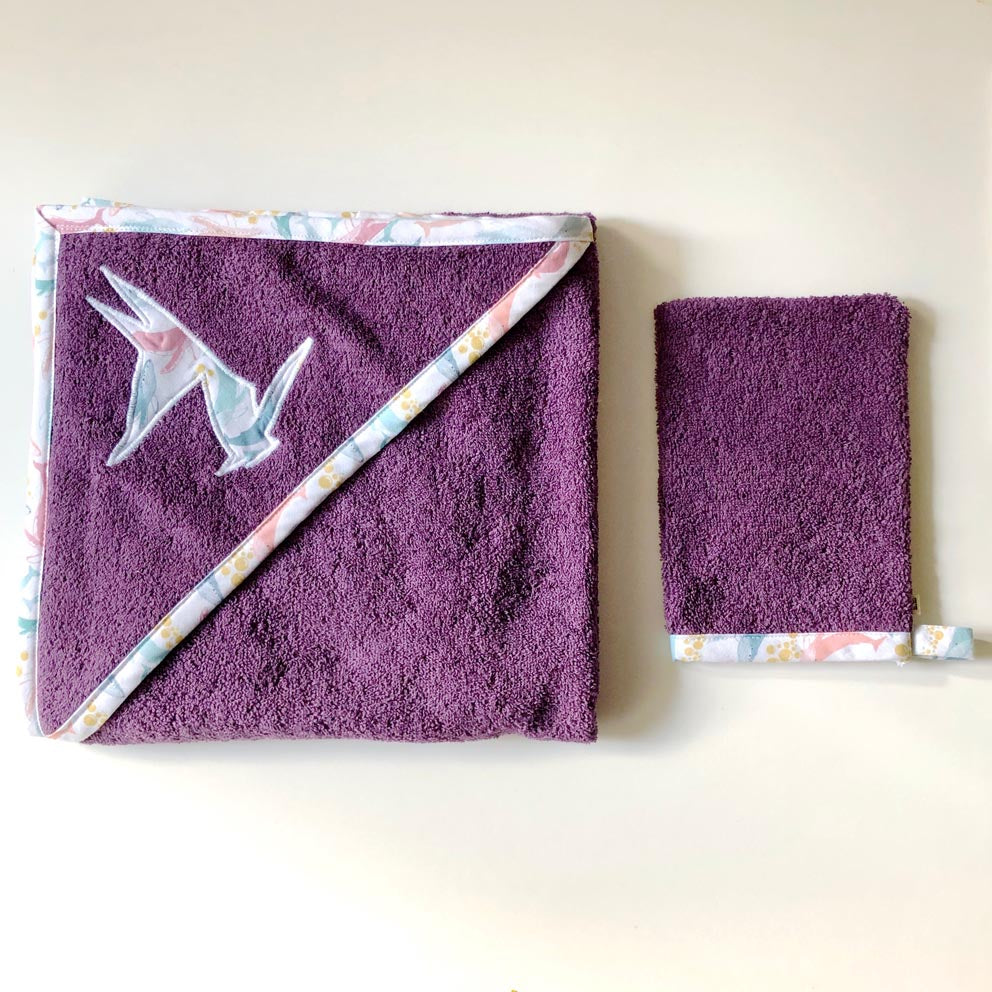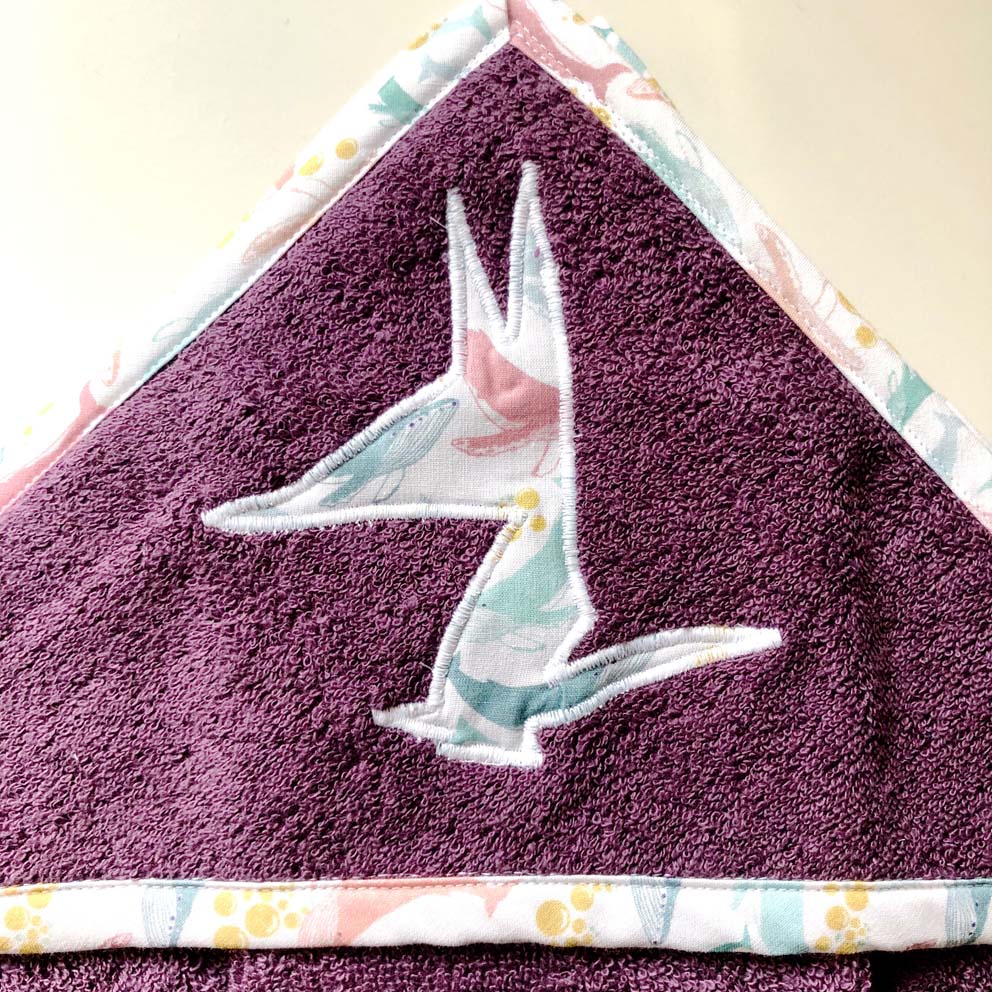 Eponge violette assortie d'un biais en tissu coton à motifs baleines. Applique loup sur la capuche.