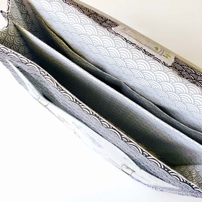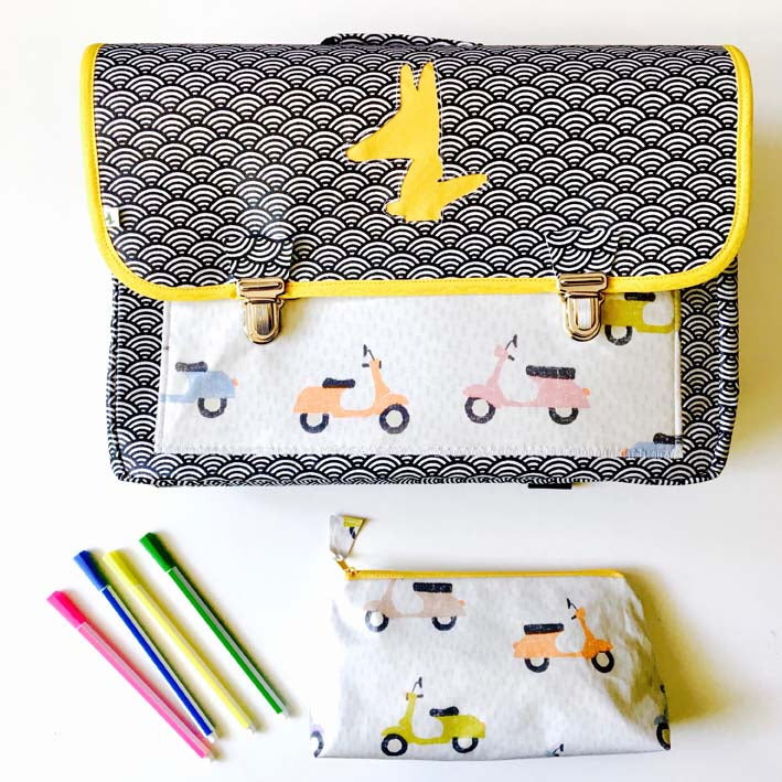 Cartable en tissu enduit noir et blanc à motifs vagues, la poche extérieure est en tissu enduit à motifs scooters , doublure intérieure du cartable en tissu coton gris à motifs vagues . Applique petit loup en tissu jaune assorti au biais extérieur.