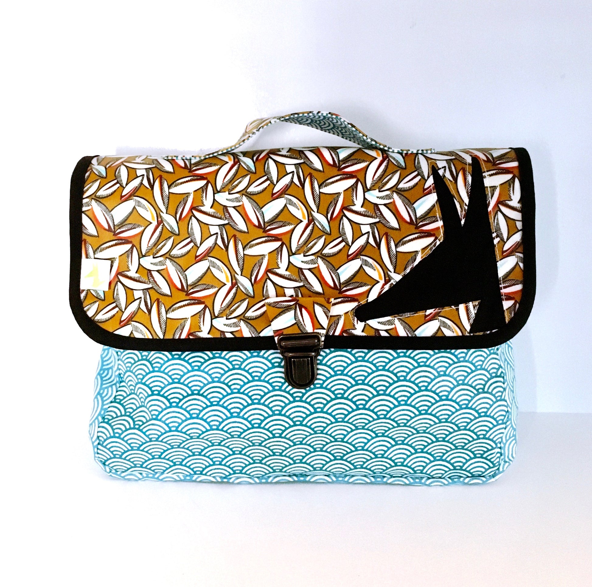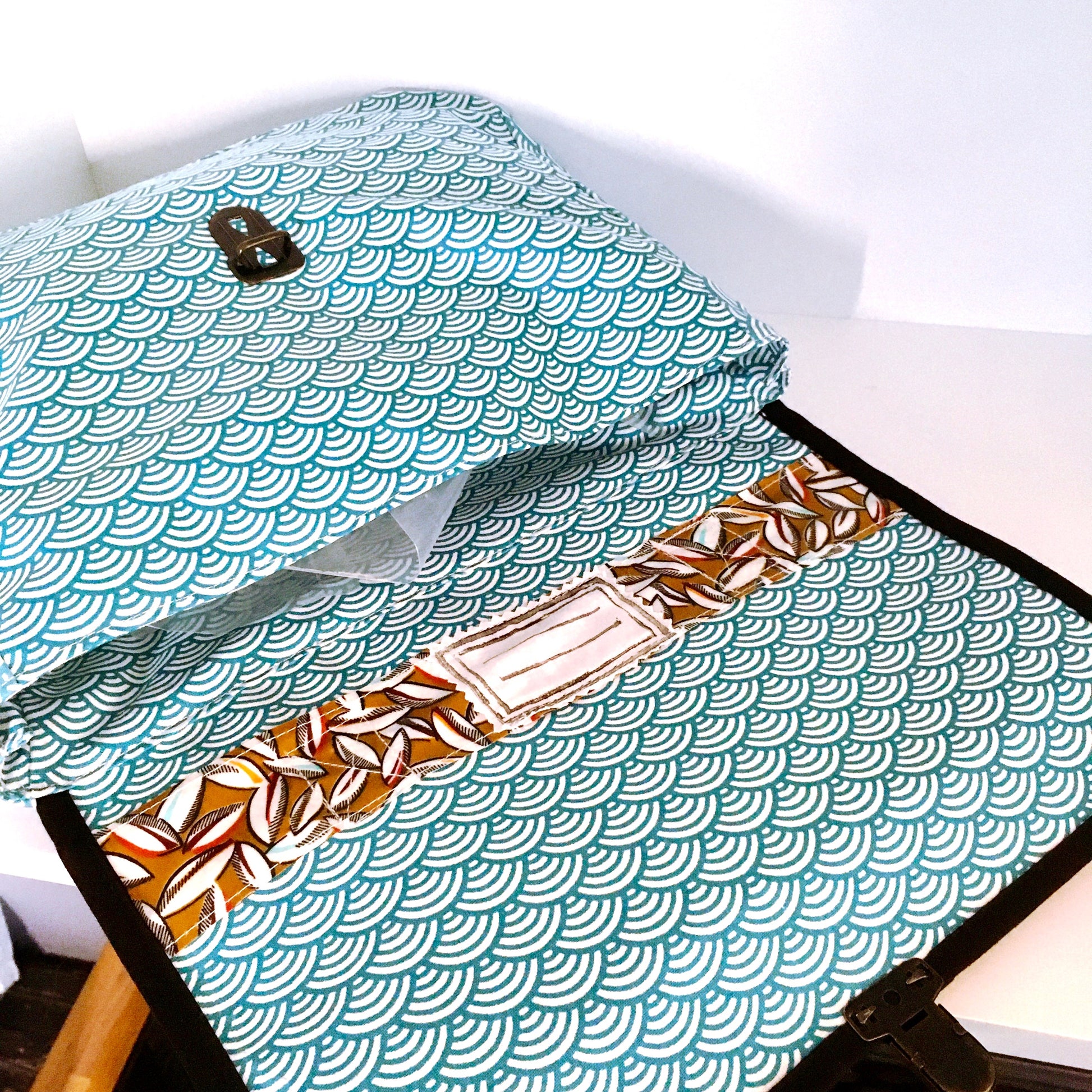 Cartable imperméable en tissu enduit marron à motifs cabosses et bleu et blanc motifs japonisants , doublure intérieure du cartable en coton assorti bleu et blanc. Applique petit loup en tissu noir assorti au biais extérieur.