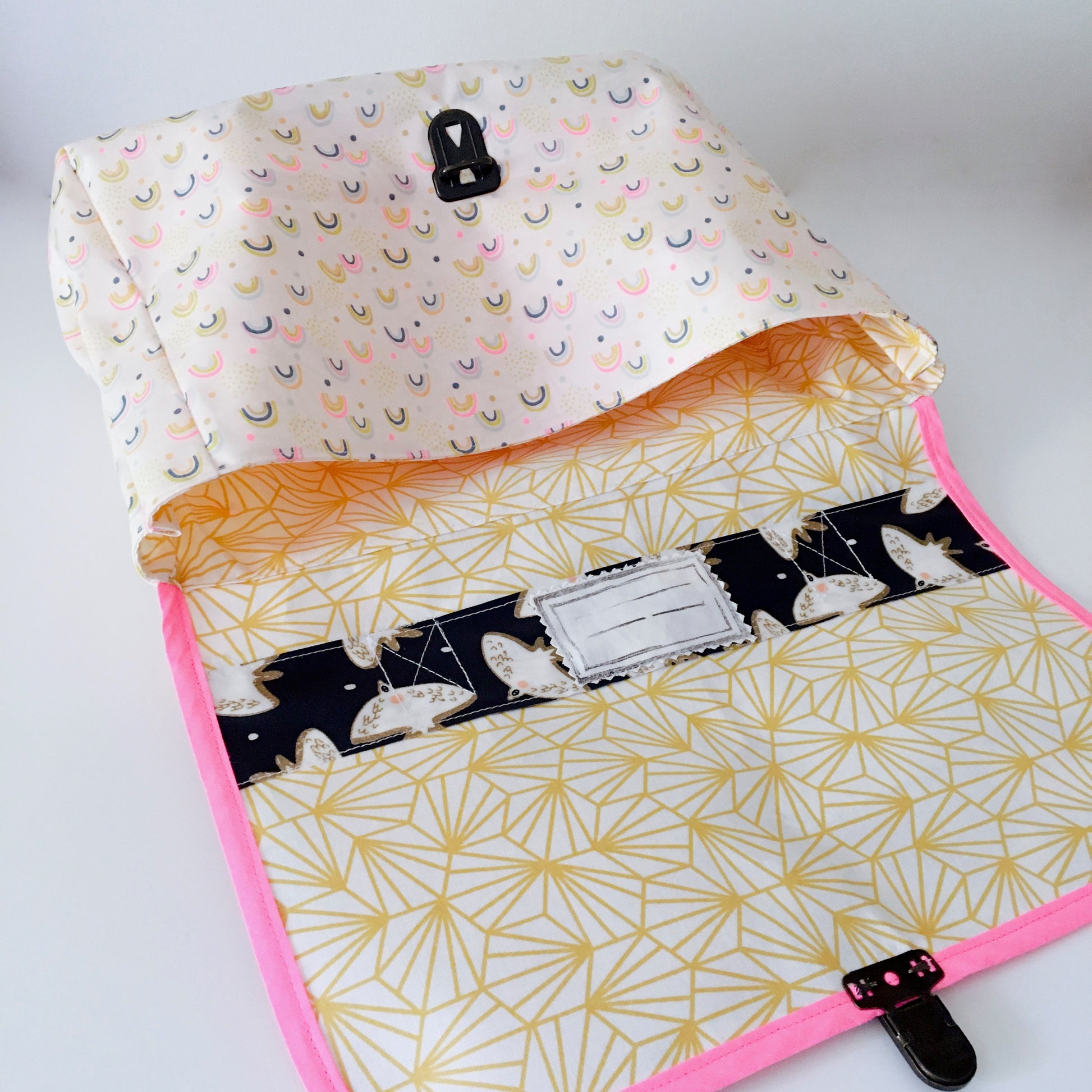 Un compartiment à l'intérieur doublé en tissu blanc à motifs origamis jaunes . Étiquette en coton à l'intérieur pour inscrire le nom de l'enfant.
