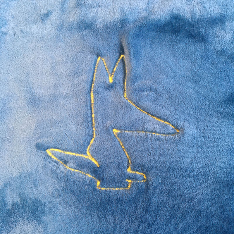 Côté face en jersey 100% coton bleu-ciel à motifs poissons et bateaux avec applique Piolou et côté réversible bleu pétrole en polyester type peluche, toucher doux.
