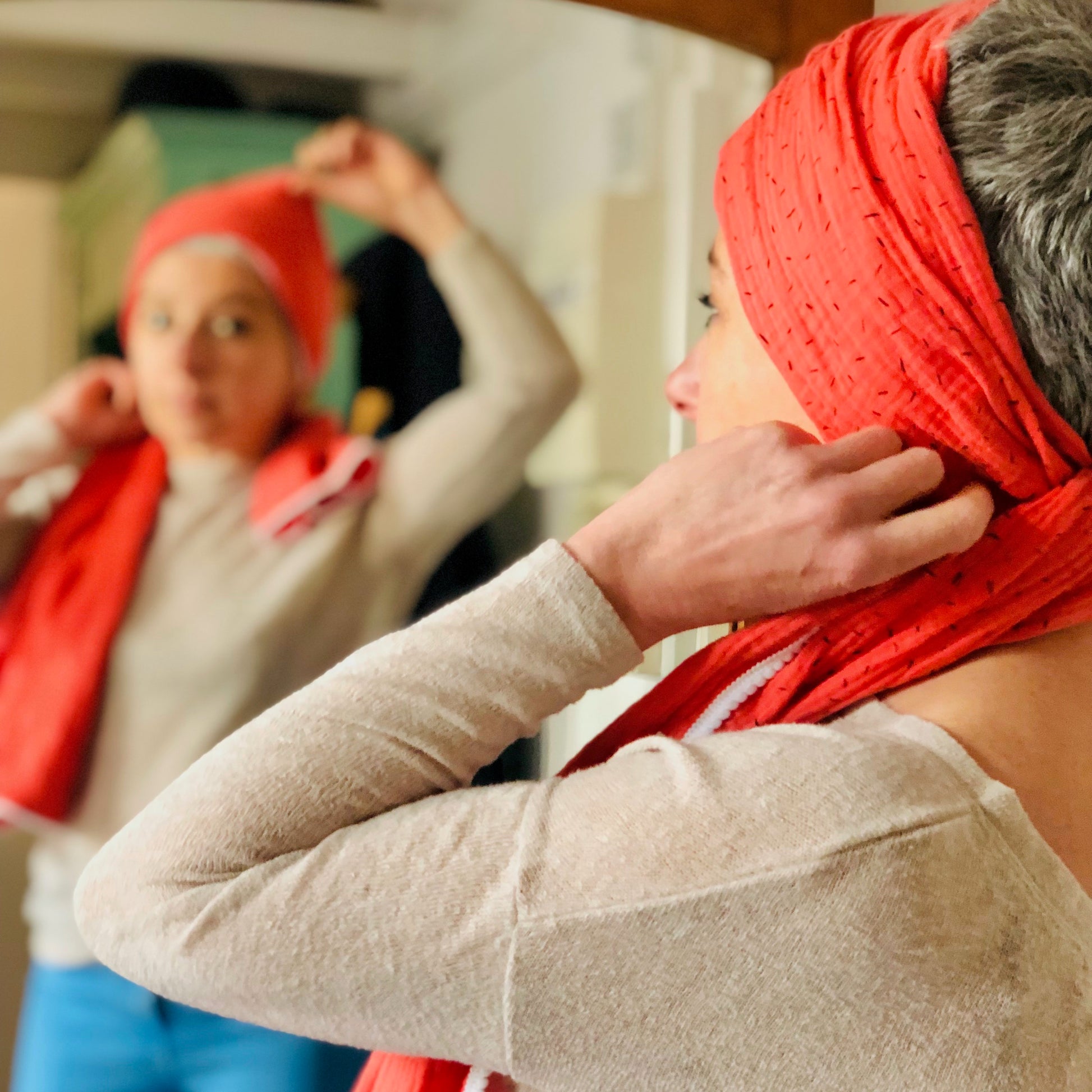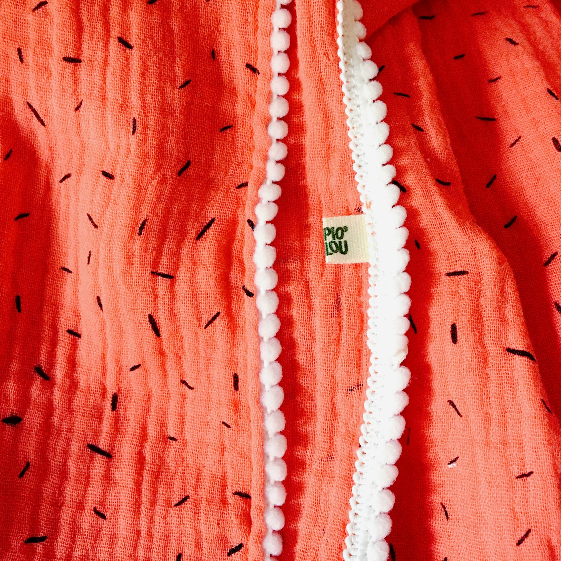 Foulard en double gaze de coton couleur corail à motifs noirs rehaussé d'un galon pompons blanc en polyester. Doux, léger et agréable à porter.