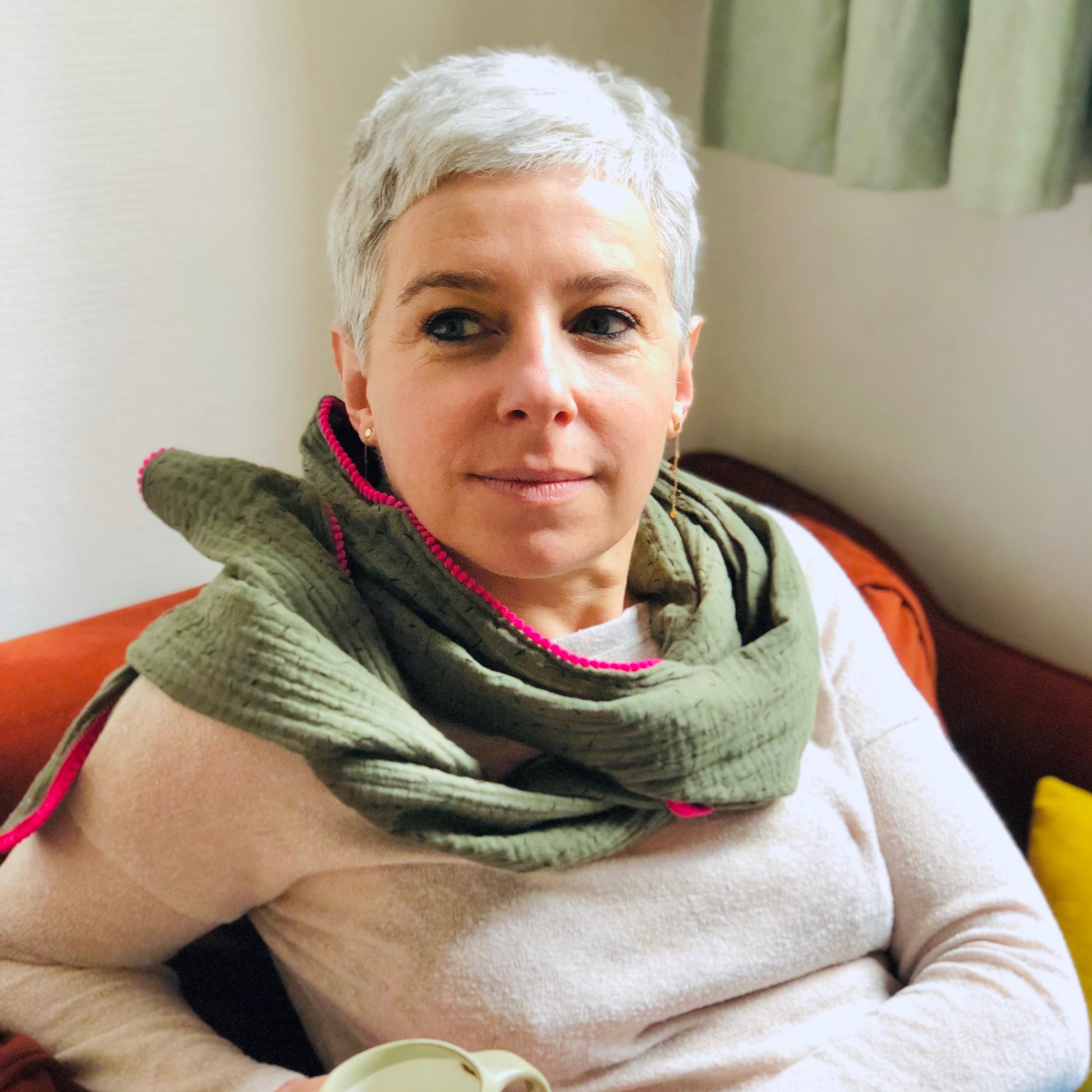 Foulard en double gaze de coton couleur kaki à motifs noirs rehaussé d'un galon pompons rose fushia en polyester. Doux, léger et agréable à porter.