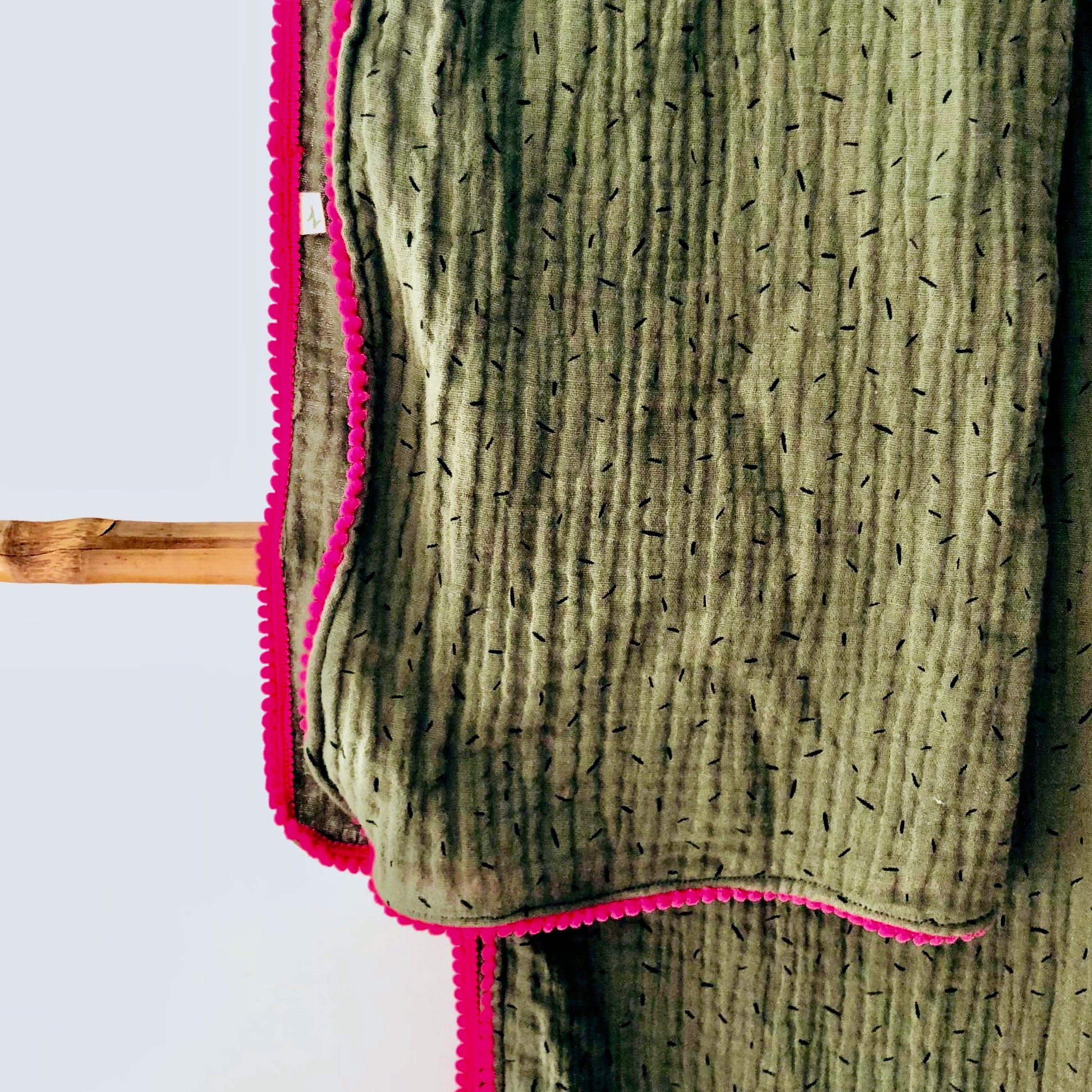 Foulard double gaze de coton kaki à motifs et pompons roses
