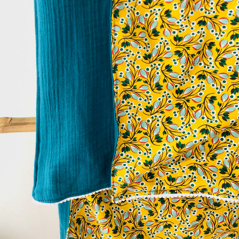 Foulard réversible gaze de coton bleu canard et viscose jaune fleurie