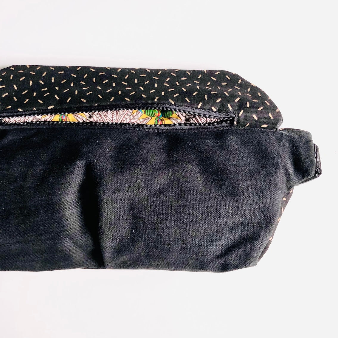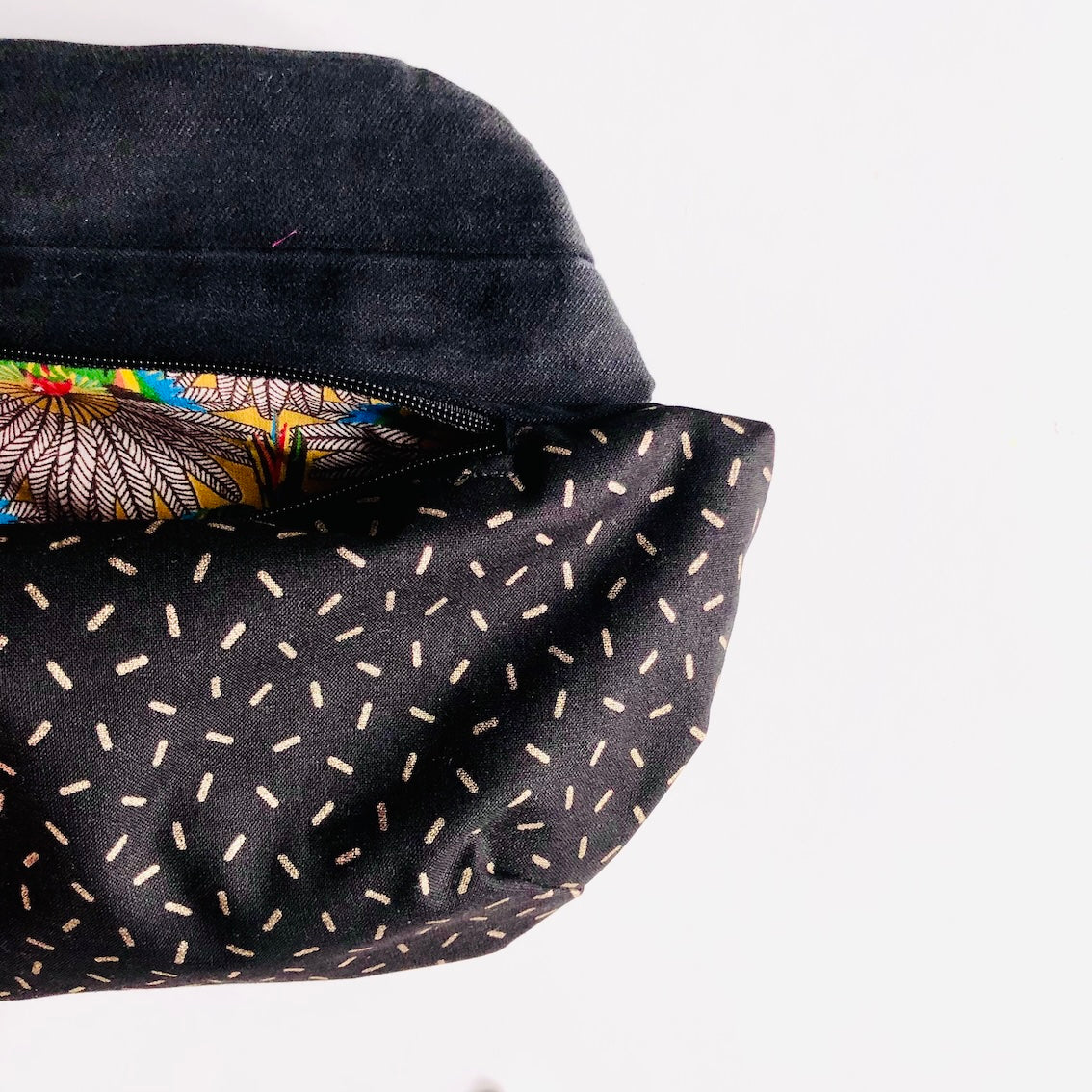 Elle est en tissu enduit noir doré, le fond en jean upcyclé doublé d'un tissu coton multicolore à motifs aras.