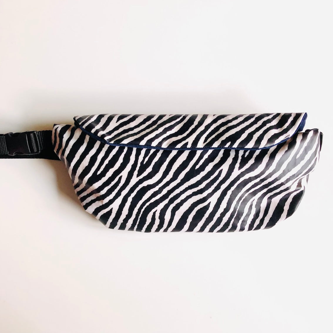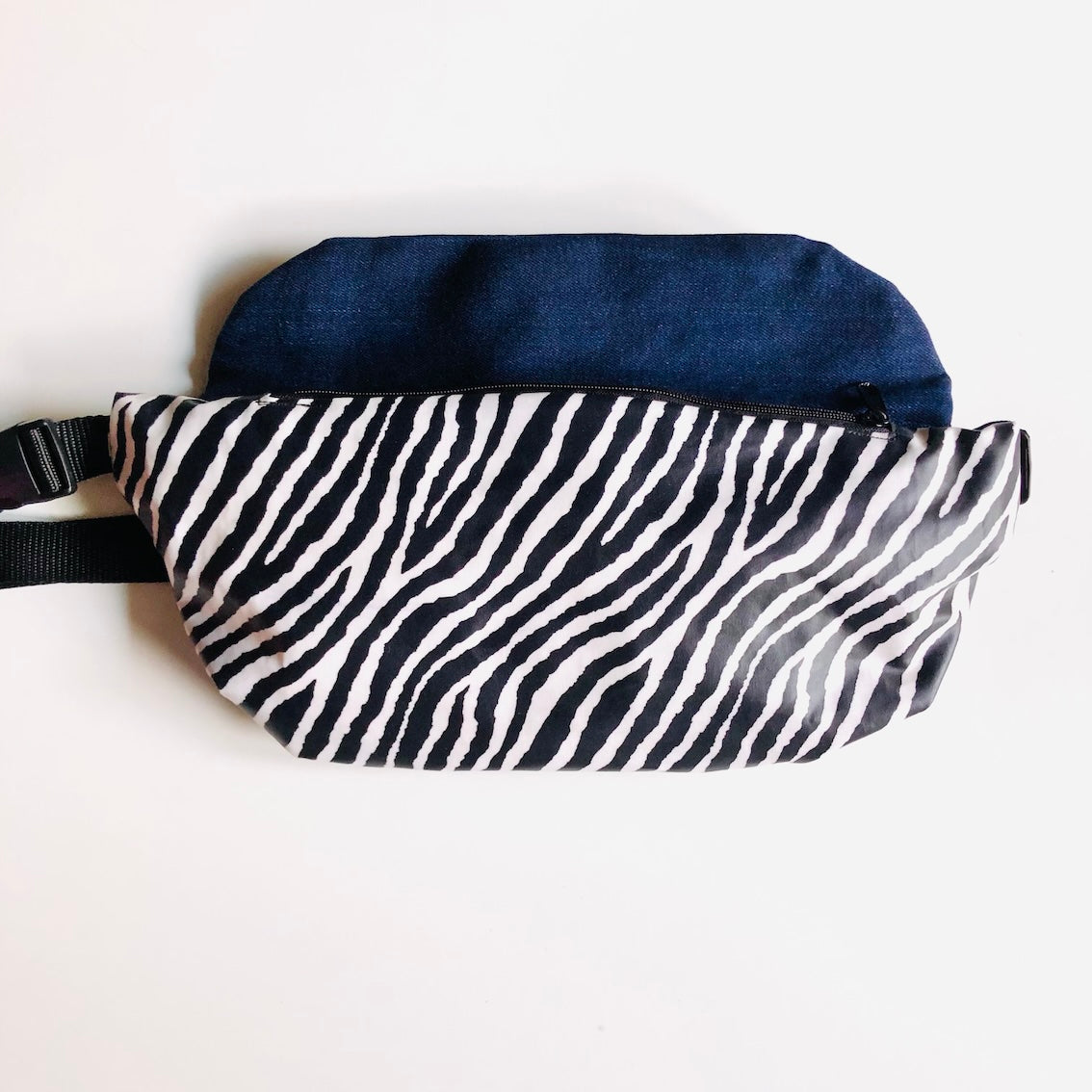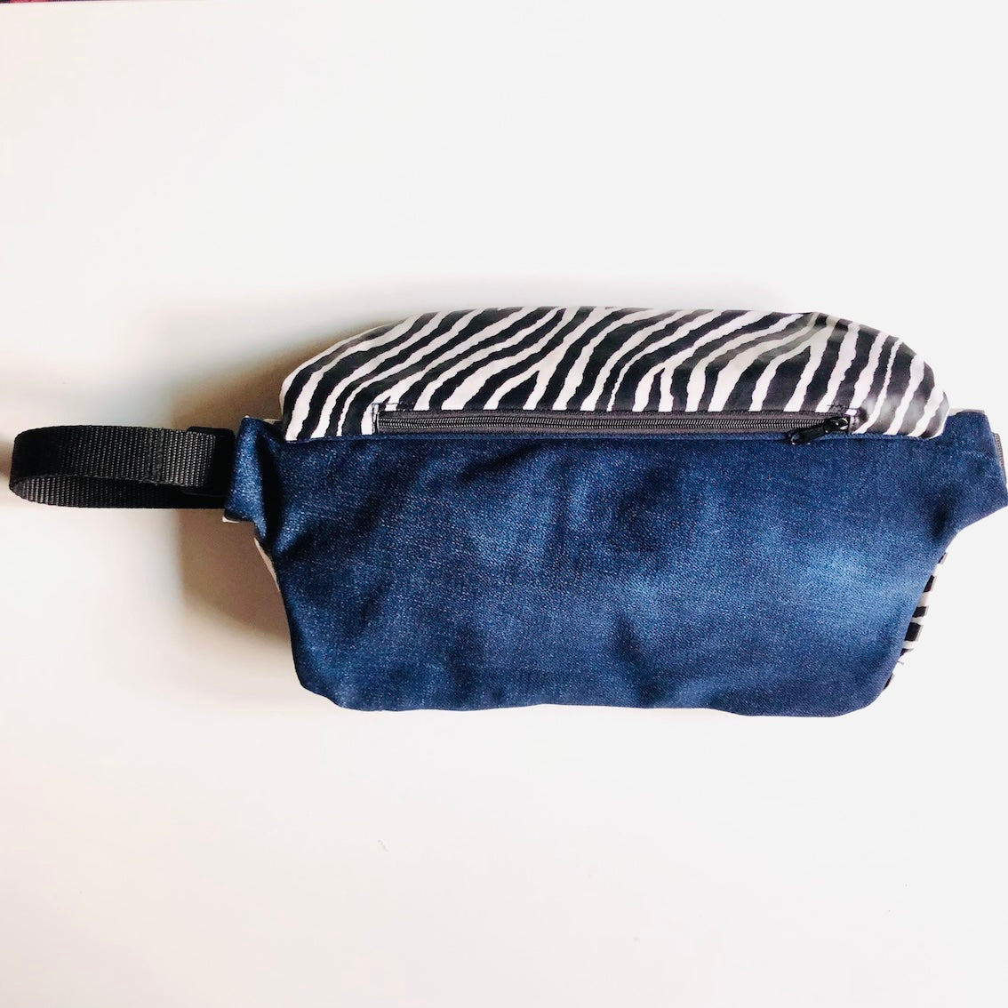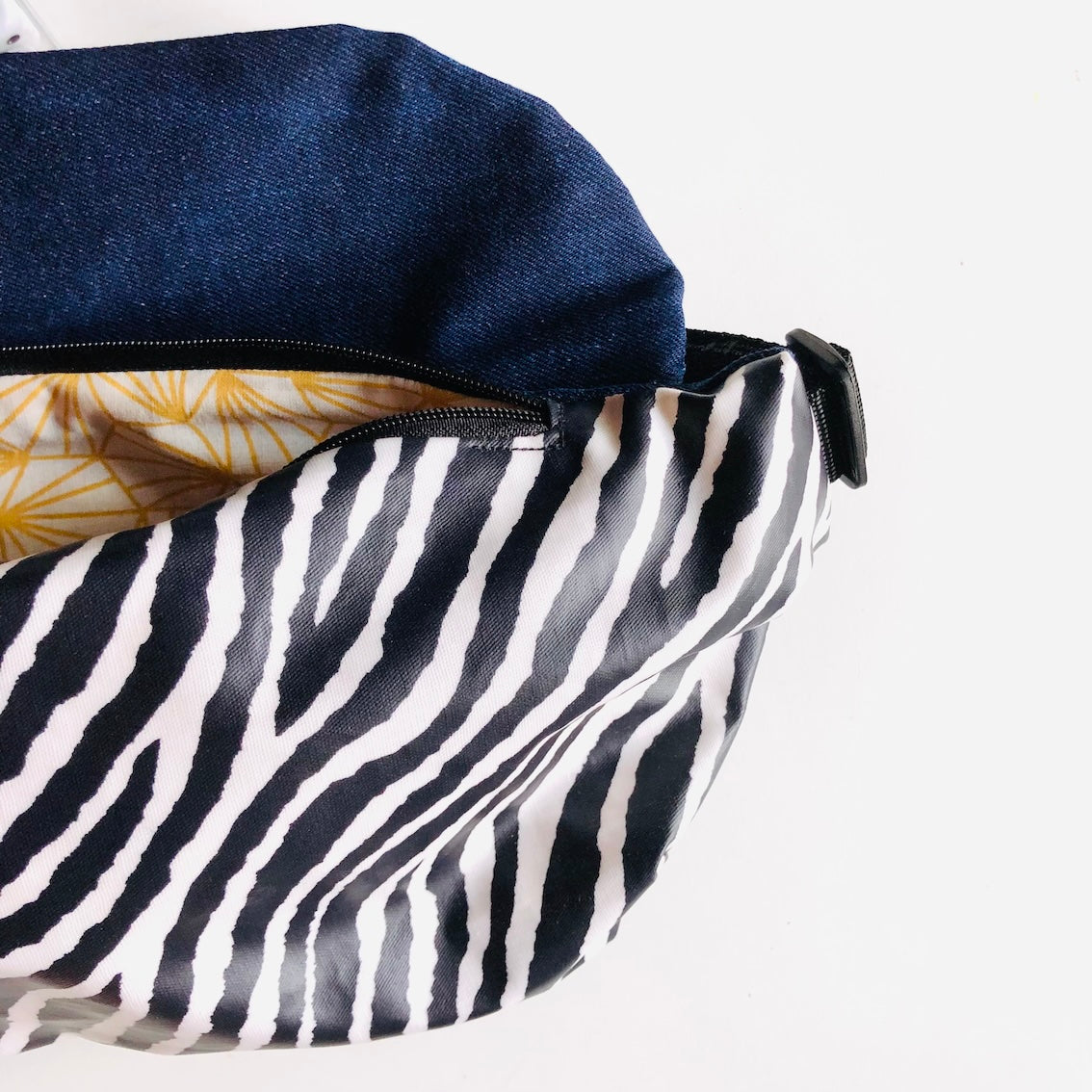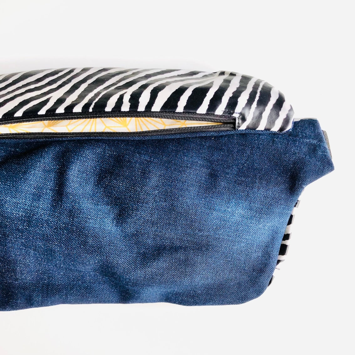 Elle est en tissu coton enduit zèbre, le fond en jean upcyclé doublé d'un tissu coton blanc à motifs graphiques jaunes.