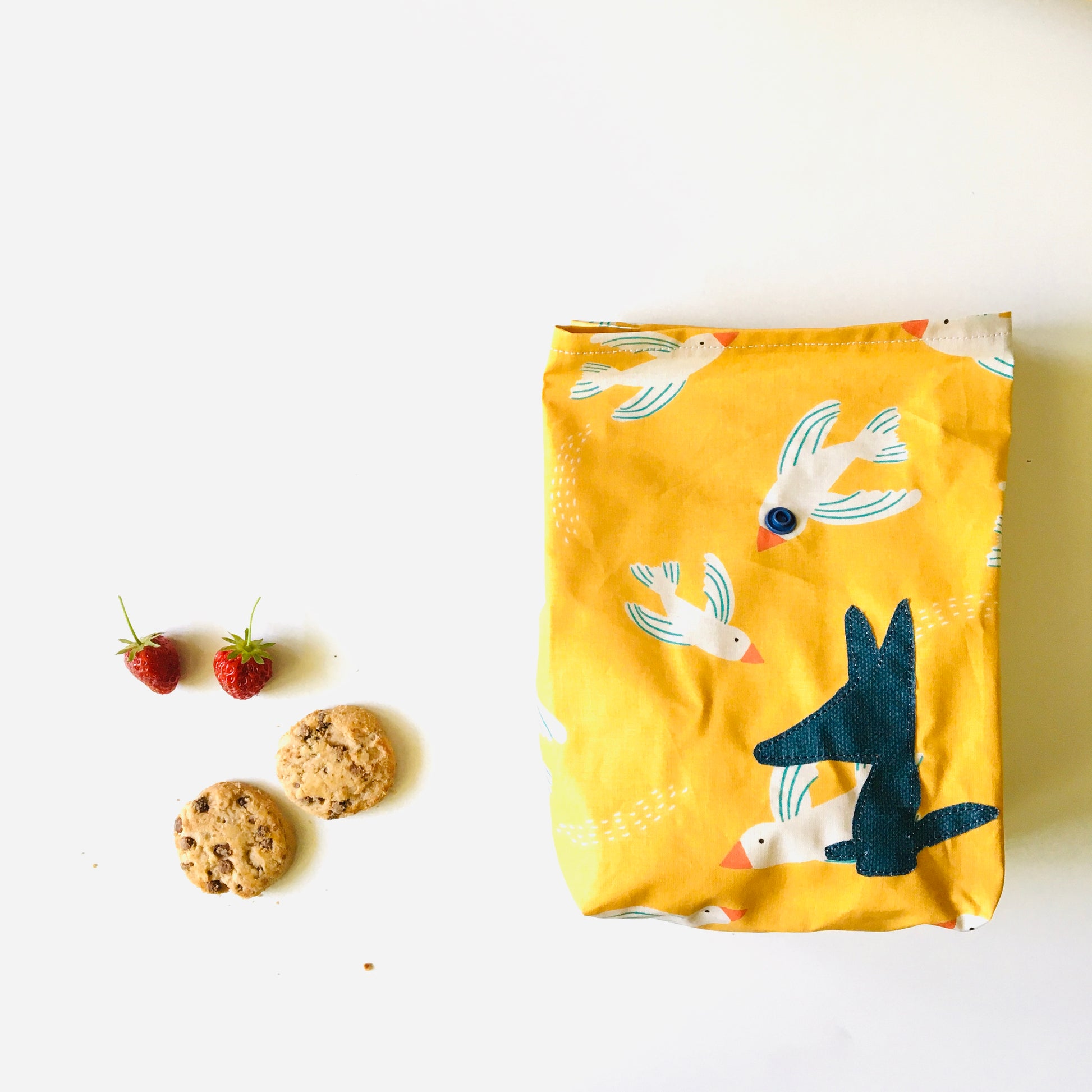Lunch bag en tissu enduit jaune à motifs oiseaux avec fermeture à pression en résine bleue. Applique piolou bleue.