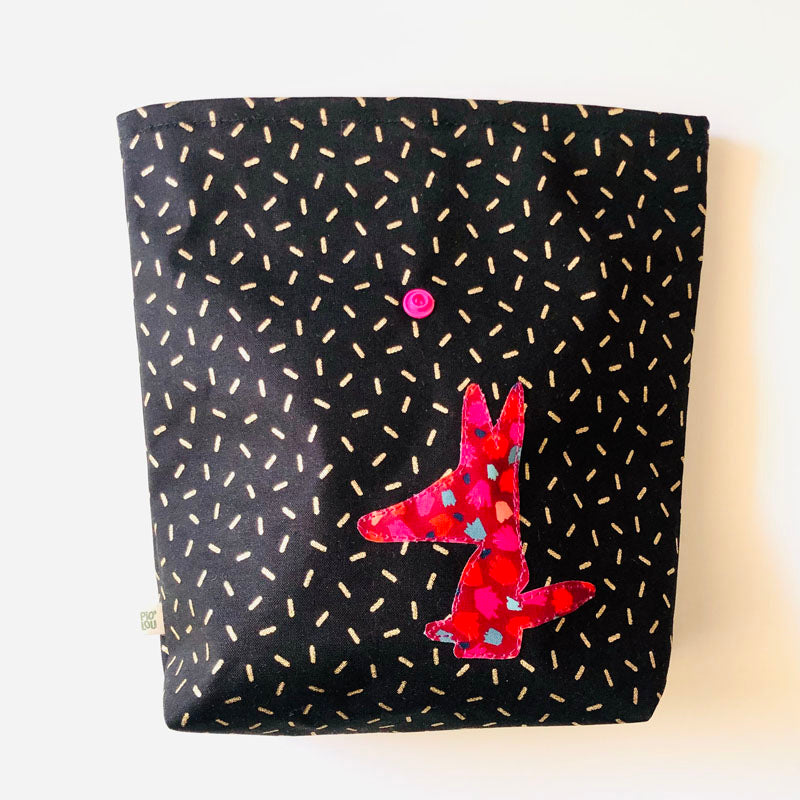 Lunch bag en tissu enduit noir doré rose (aspect tissé, l'enduction est sur le verso du tissu) avec fermeture à pression en résine rose. Applique piolou rose à motifs.