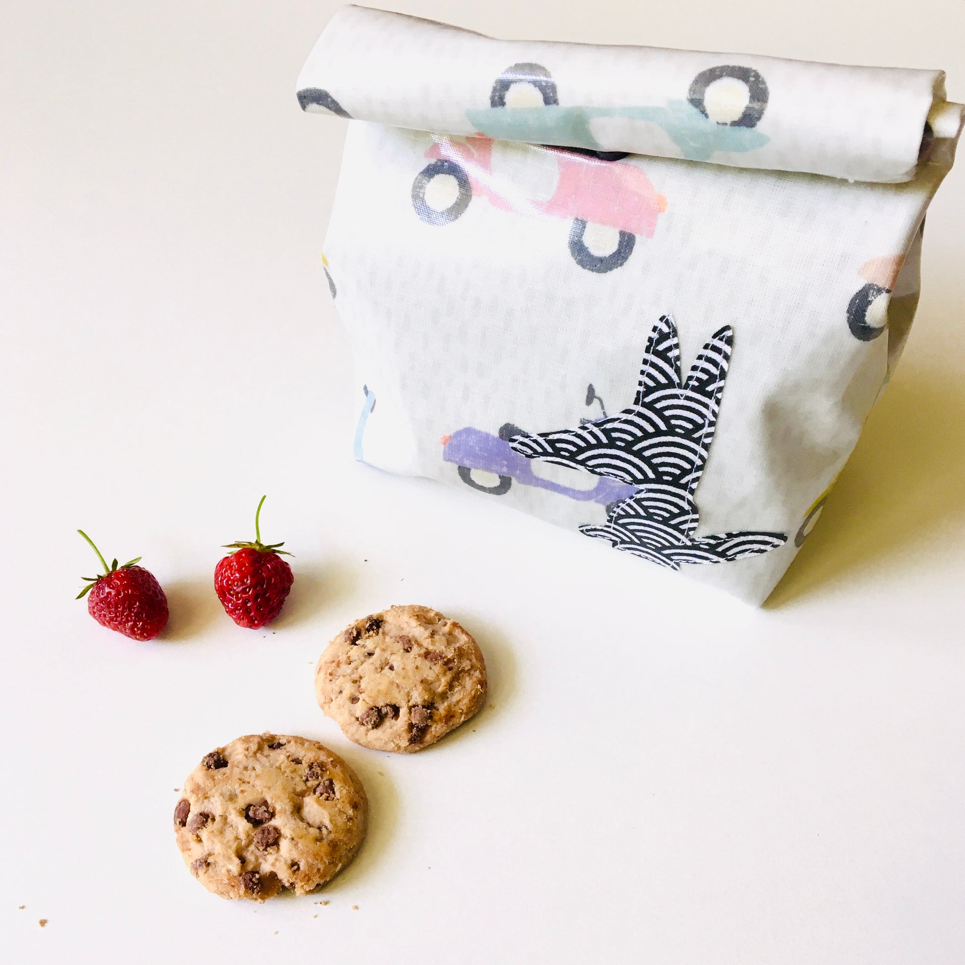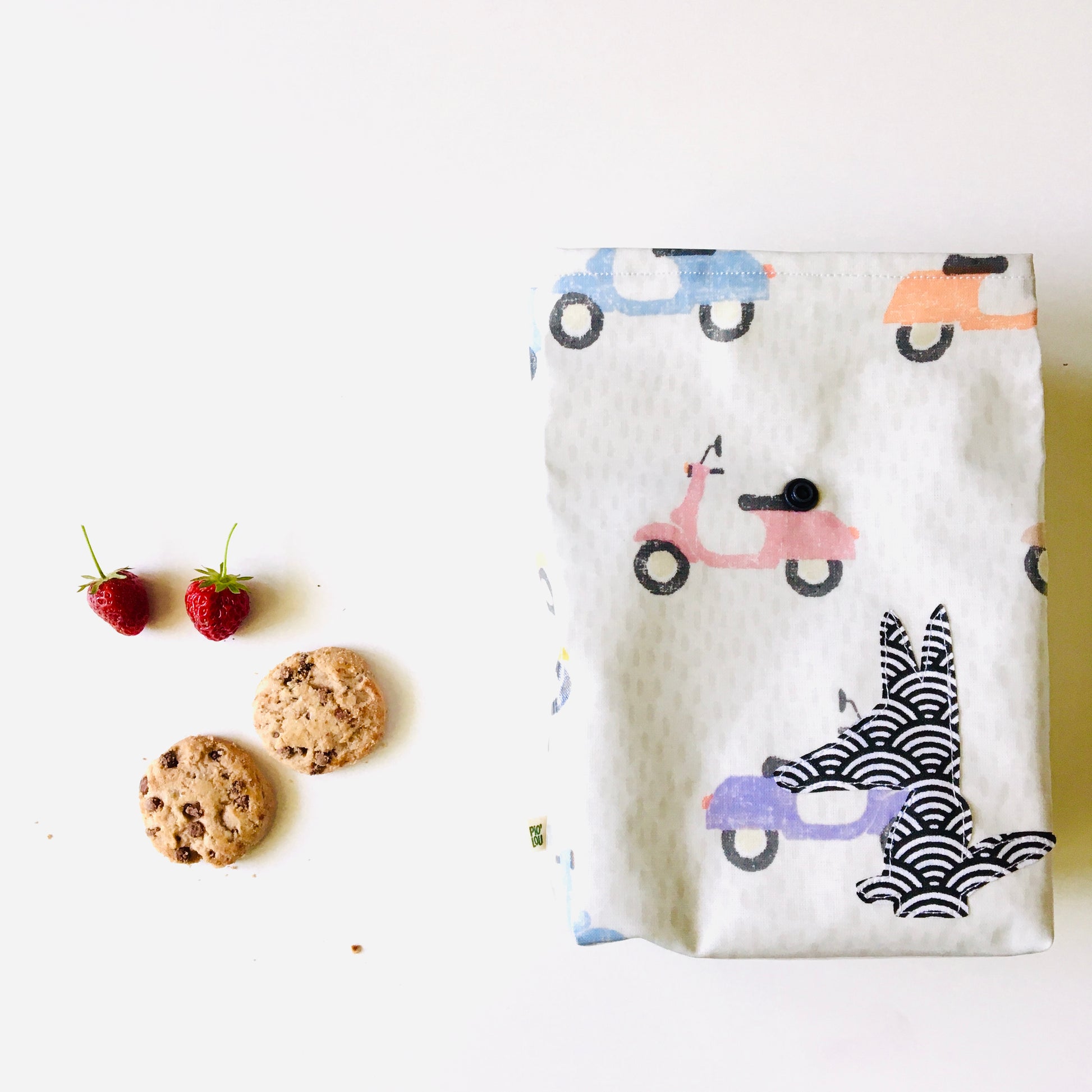 Lunch-bag en tissu enduit blanc à motifs scooters multicolores avec fermeture à pression en résine grise. Applique piolou noir et blanc.