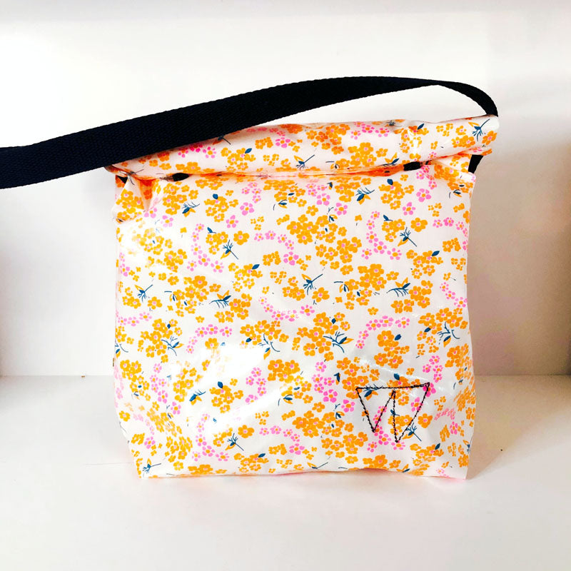 Lunch bag en tissu enduit blanc à motifs fleuris oranges, avec 2 fermetures à pression en résine noire et sangle en coton noire. Motifs triangles assortis.