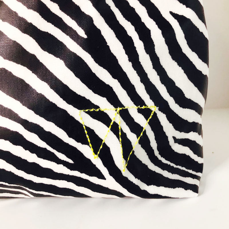 Lunch bag en tissu enduit noir et blanc à motifs zèbrés, avec 2 fermetures à pression en résine jaune et sangle en coton jaune. Motifs triangles assortis.