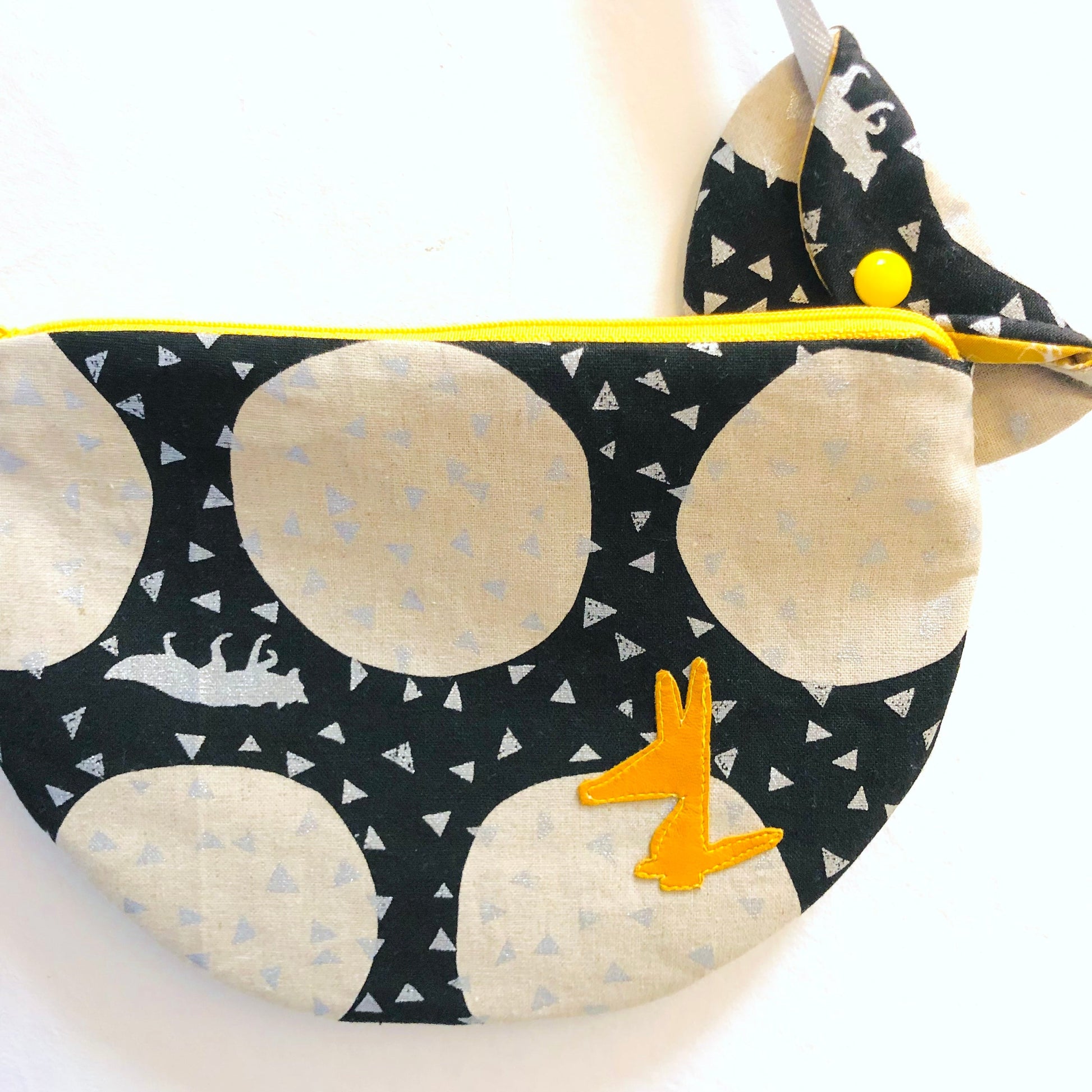 Sac en tissu coton noir et blanc avec motifs argentés. Doublure en coton jaune moutarde avec motifs fleuris. Bandoulière argentée.