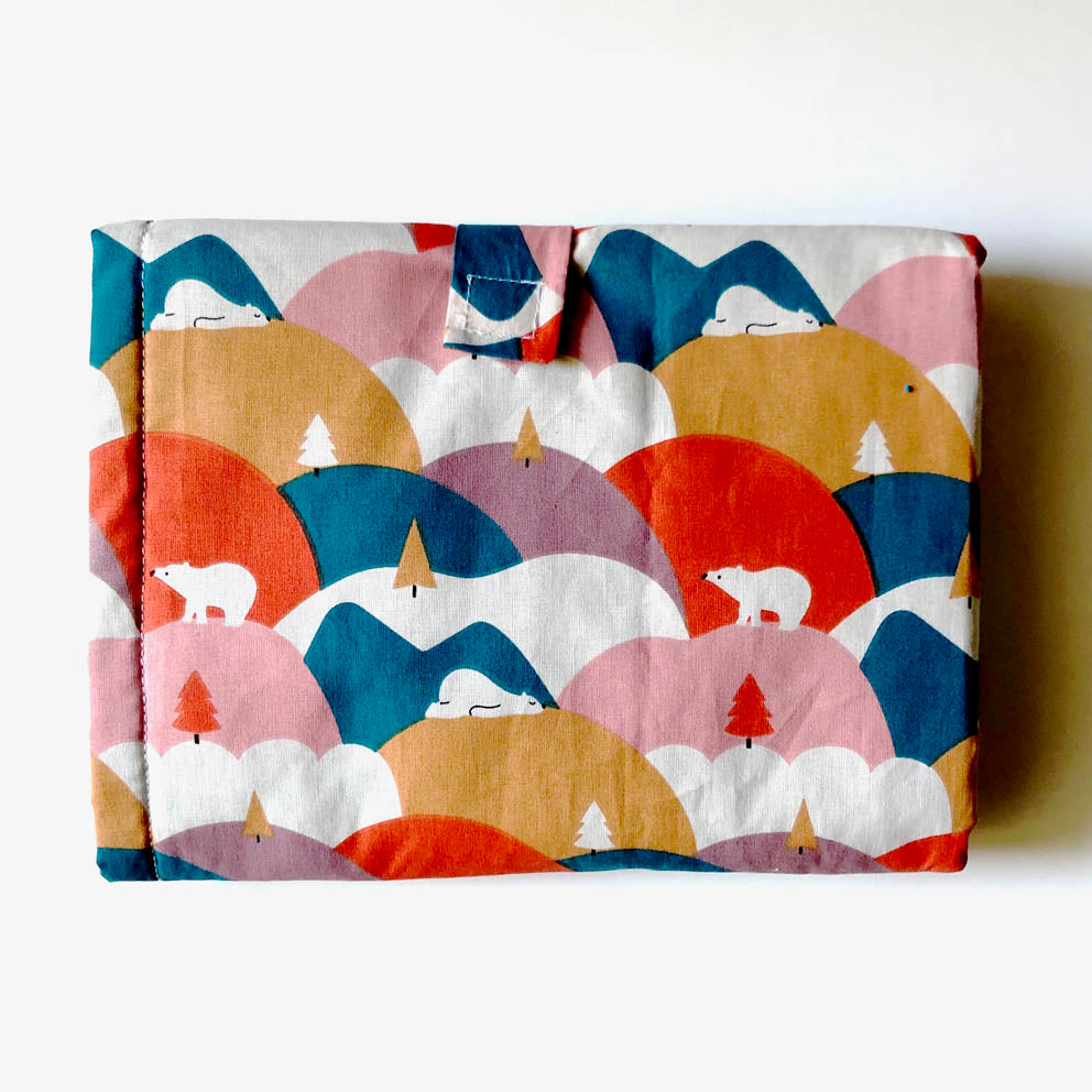 Tapis en éponge couleur bleue doublé d'un tissu en coton bleu, rouge, ocre à motifs ours polaire avec fermeture à scratch.