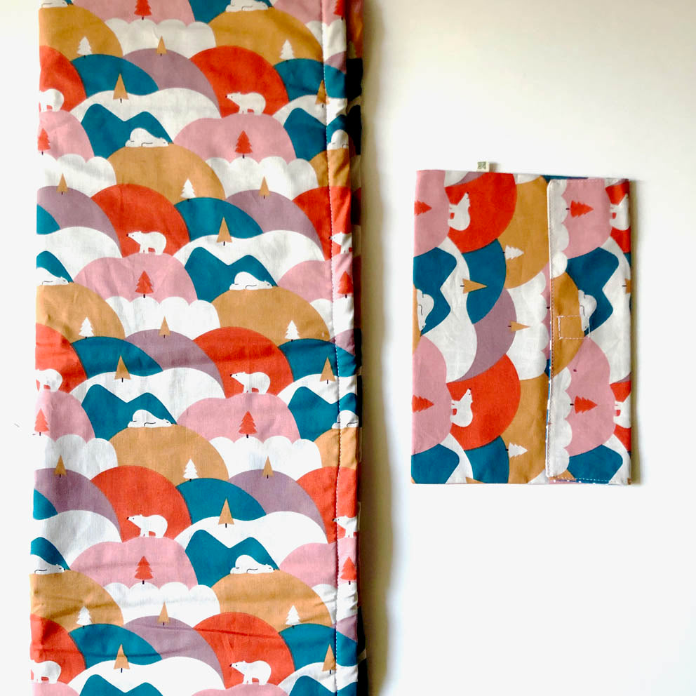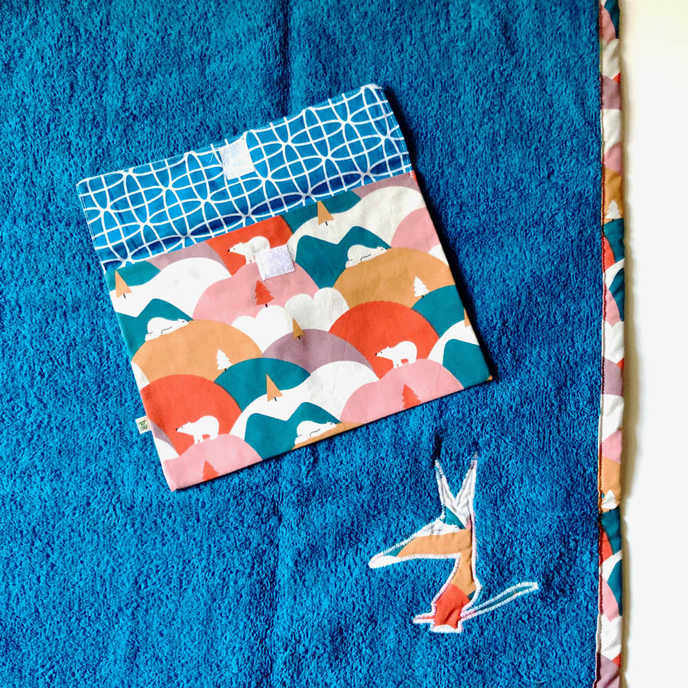 Accompagnez le tapis à langer nomade de la cape de bain et du bavoir assortis.