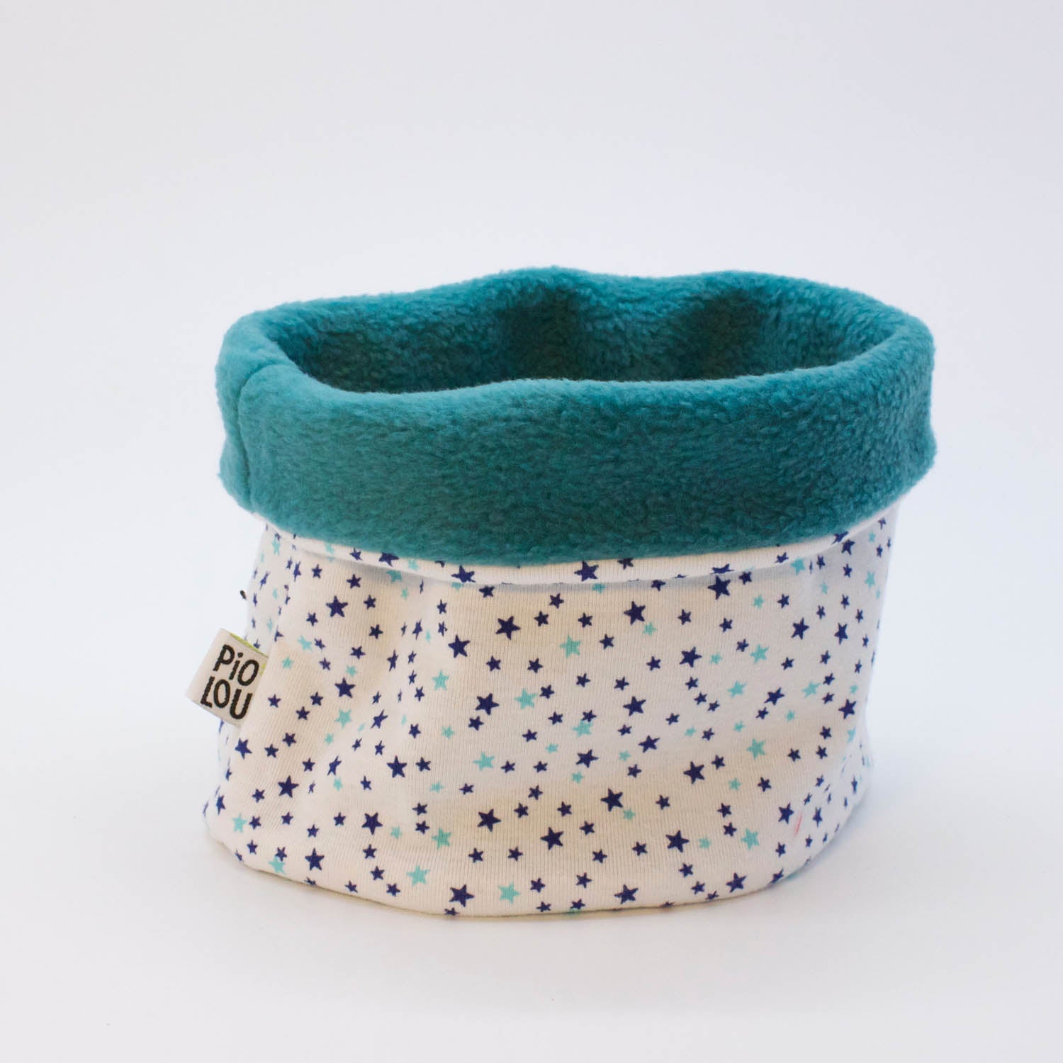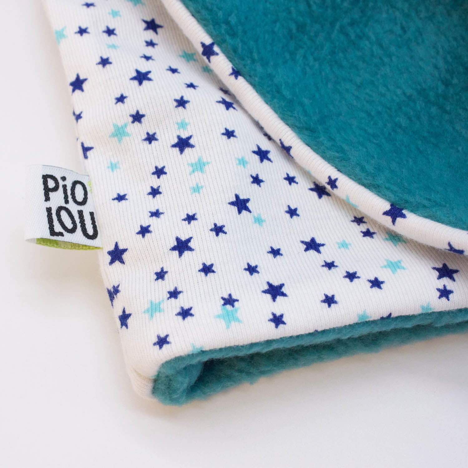 Col enfant réversible chaud et douillet pour l'hiver. Une face en jersey coton extensible blanc motifs étoiles bleues, l'autre face en polaire bleue turquoise.