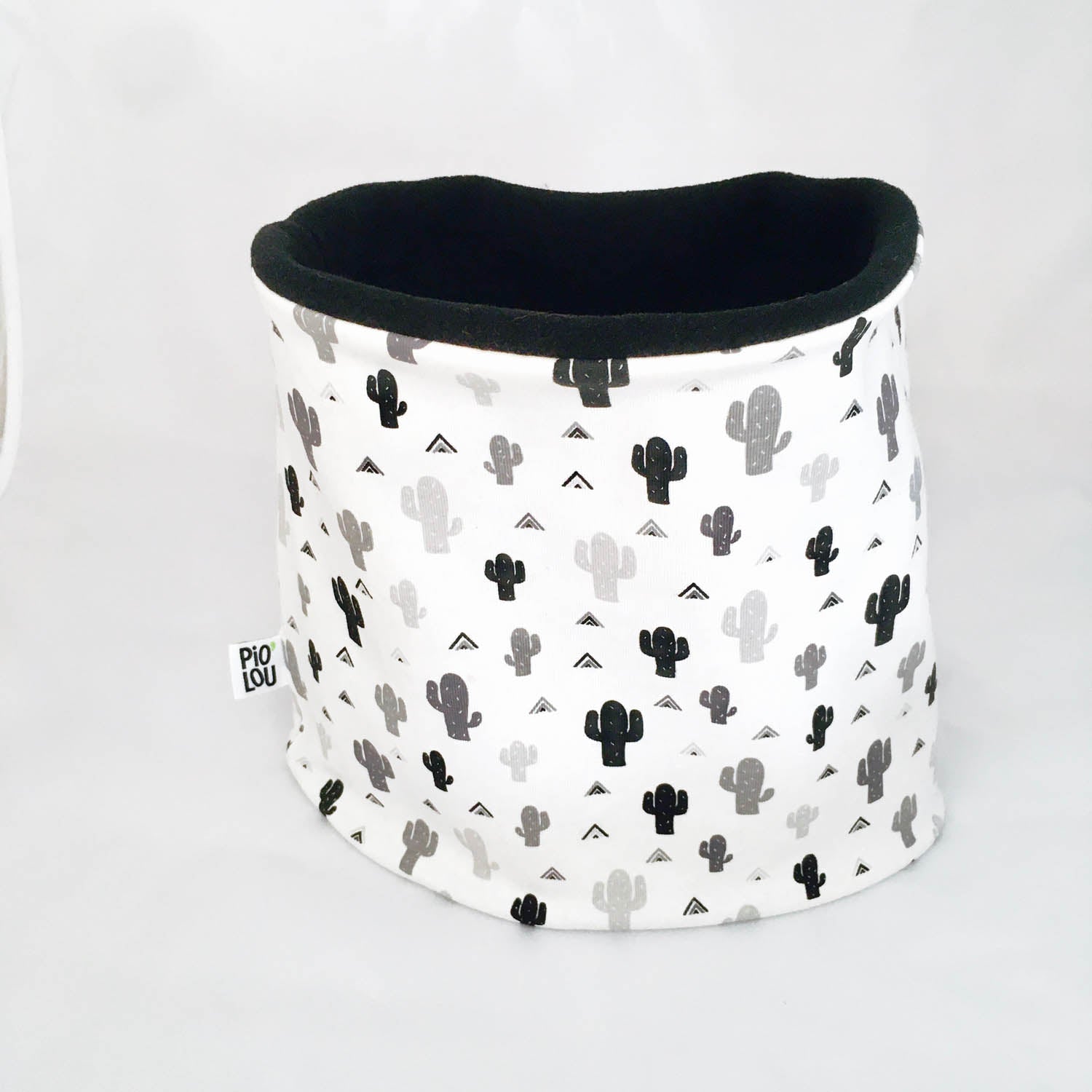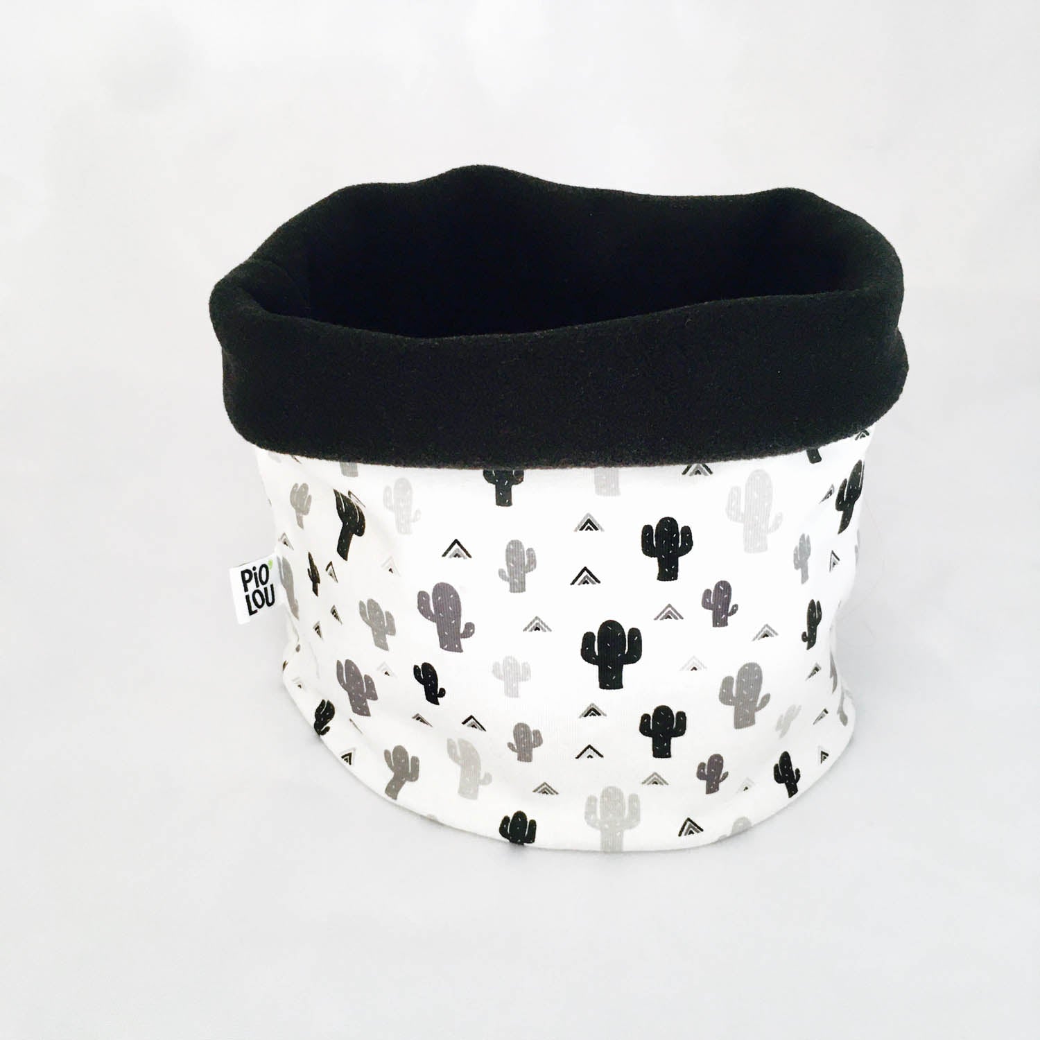 Col enfant réversible chaud et douillet pour l'hiver. Une face en jersey coton extensible blanc à motifs cactus, l'autre face en polaire noire.