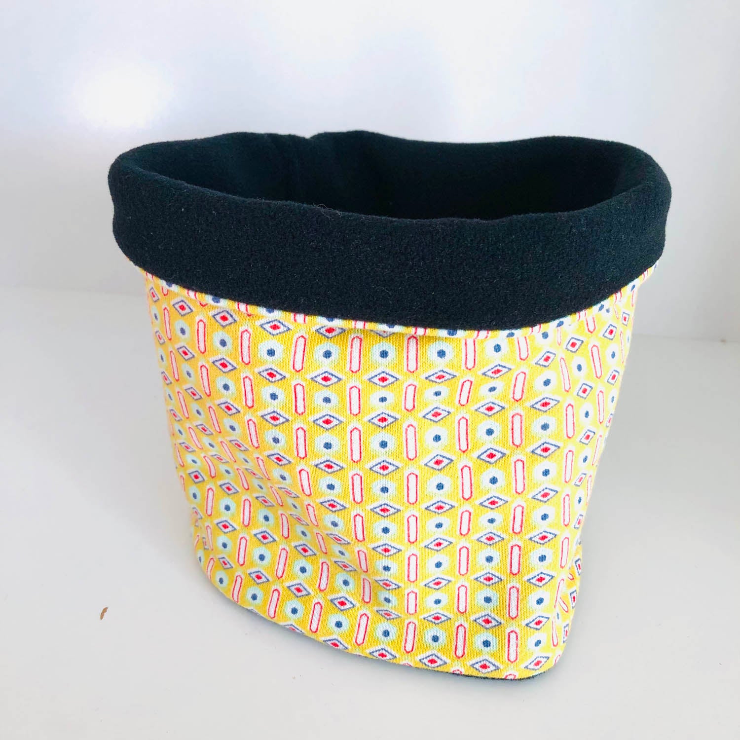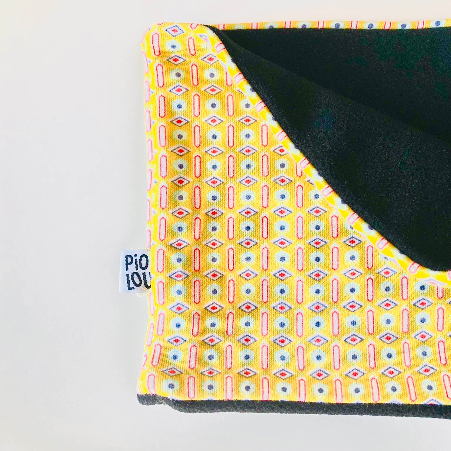 Col enfant réversible chaud et douillet pour l'hiver. Une face en jersey coton extensible jaue à motifs graphiques, l'autre face en polaire noire.